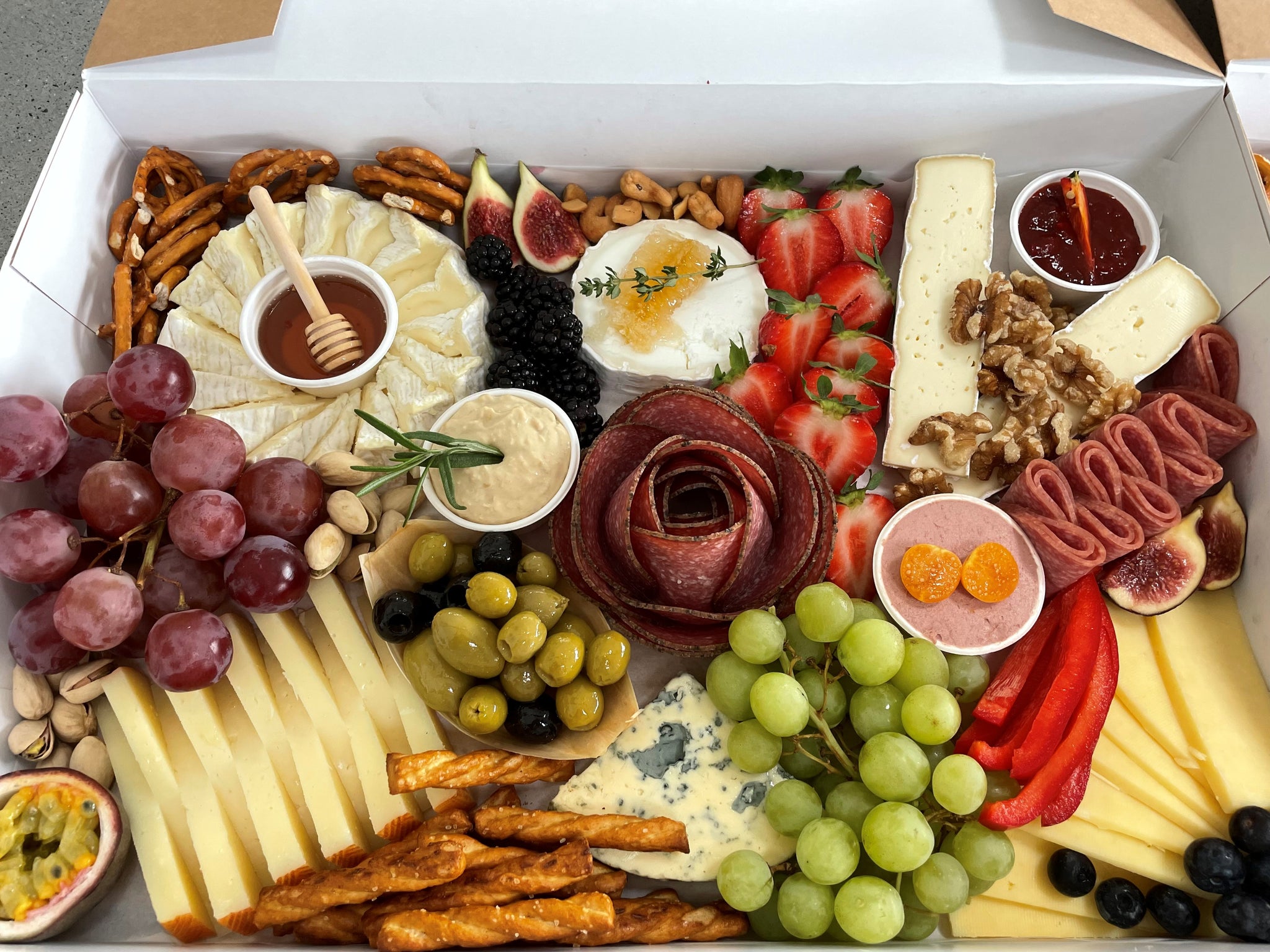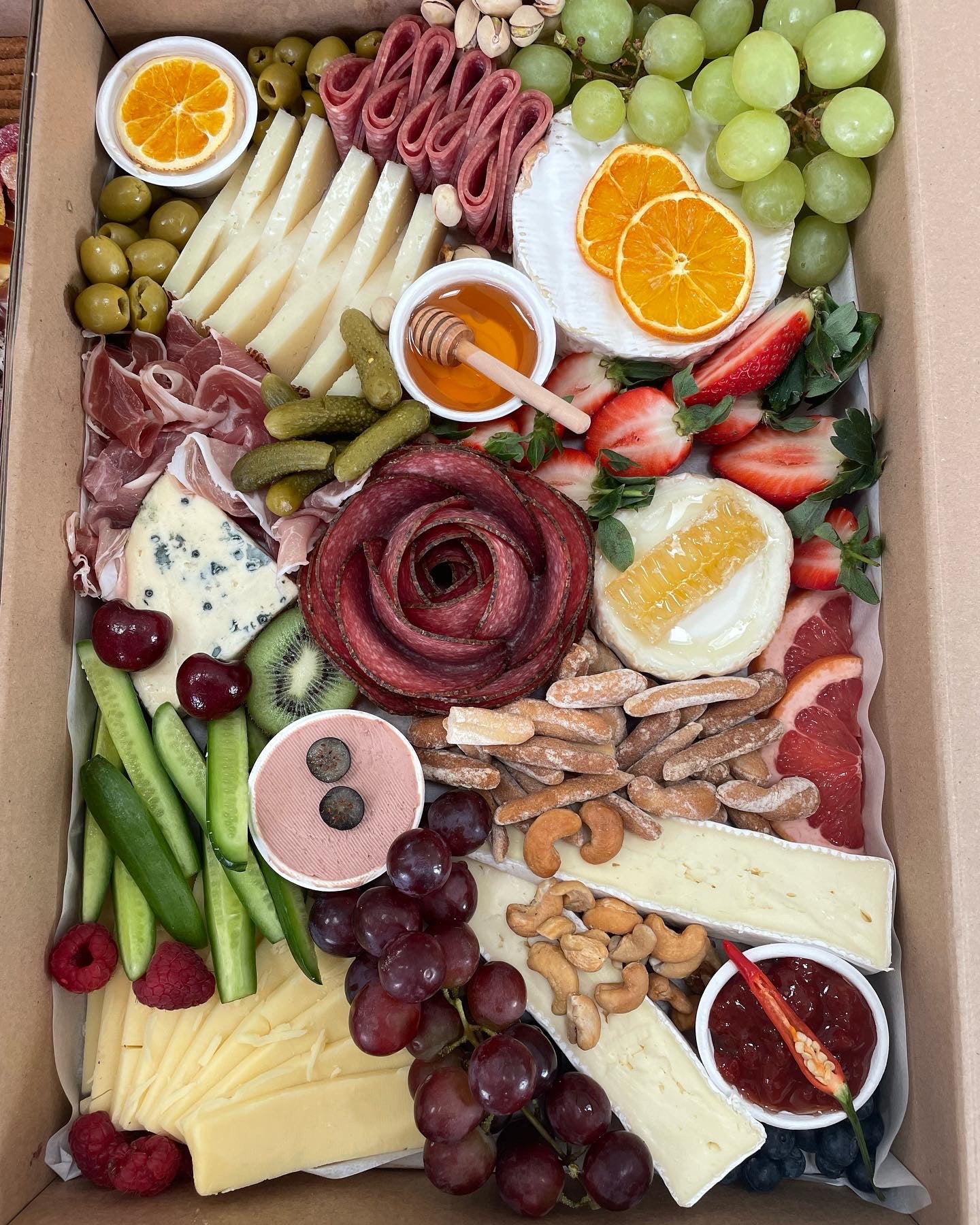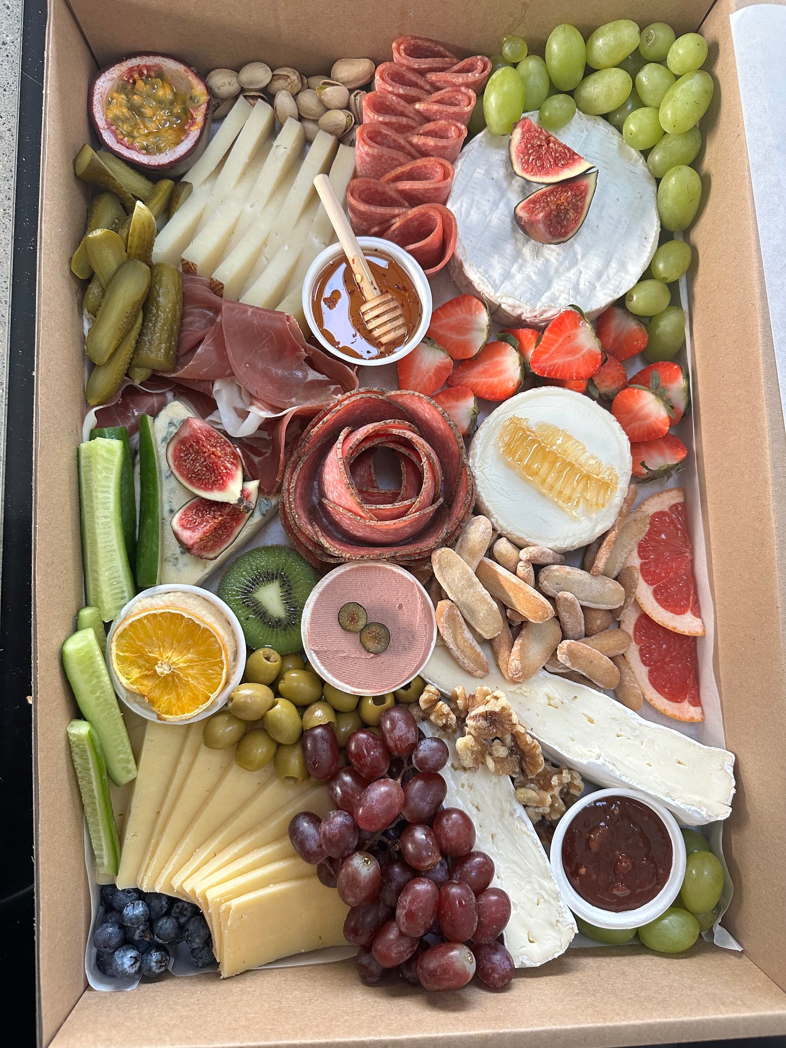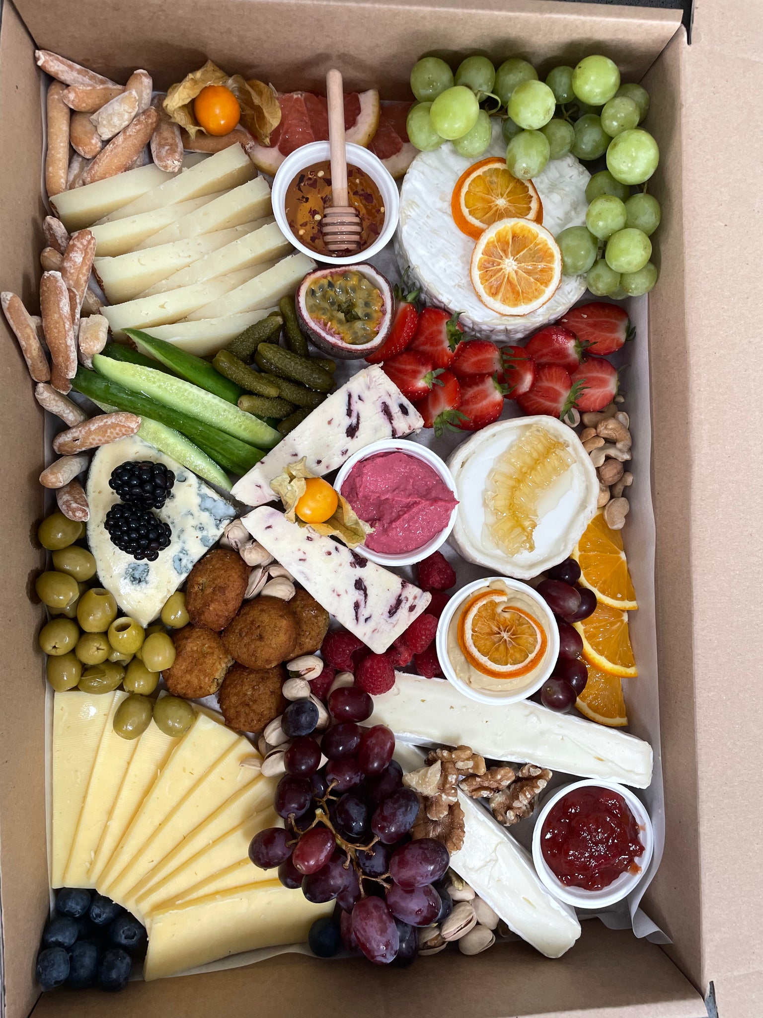 Also includes lots of seasonal fresh fruit, olives, nuts and dried fruit.