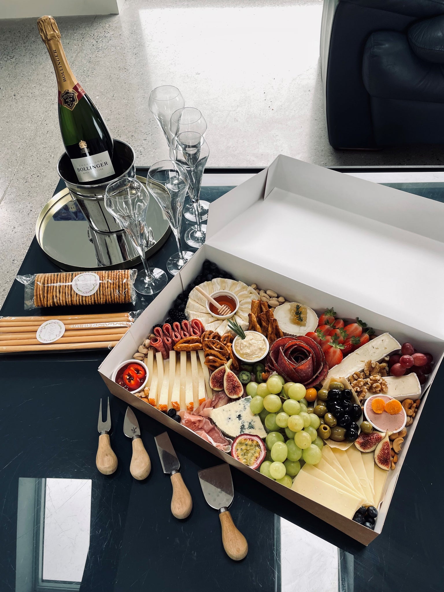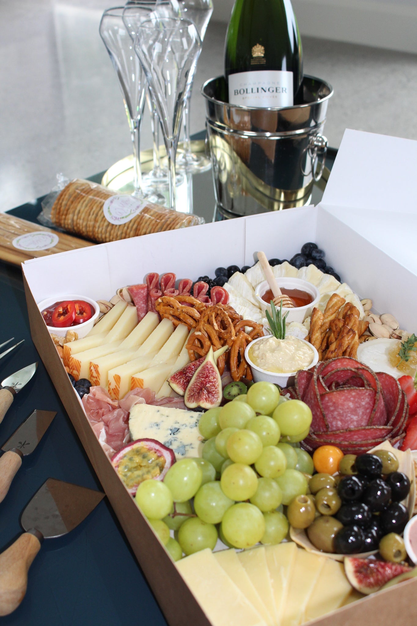 Includes 6 premium cheeses (brie, camembert, manchego, cheddar, goats and blue)